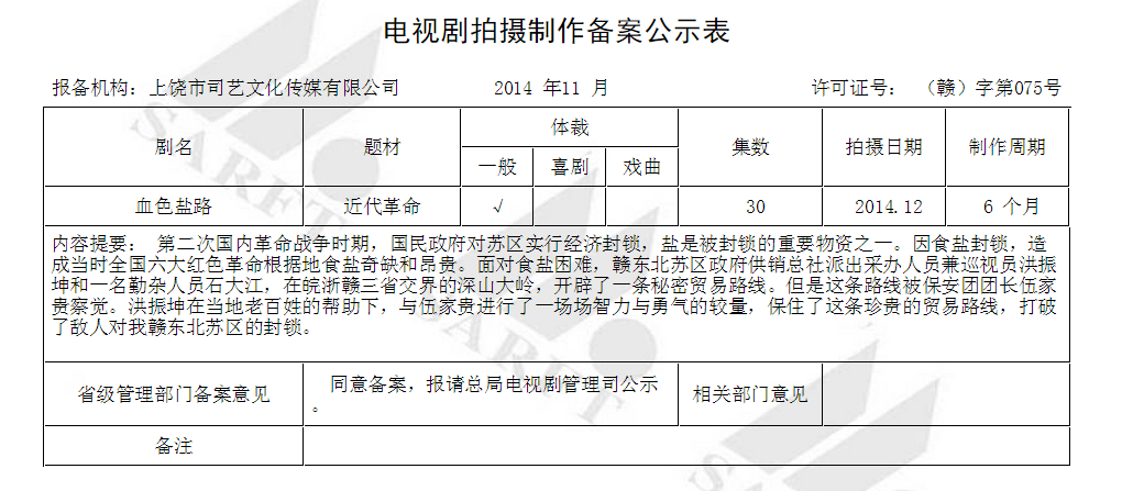 本公司申報(bào)的電視劇《血色鹽路》正式通過審批,在廣電總局官網(wǎng)2014年第11批中公示。