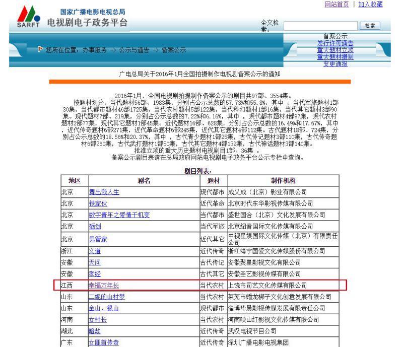 公司新作電視劇《幸福萬年長》今日取得廣電總局公示。歡迎有合作意向的單位與個人與我們聯(lián)系。