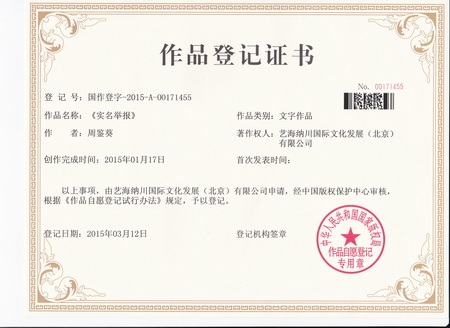 三月十五日,電影《實(shí)名舉報(bào)》文學(xué)劇本獲得國(guó)家版權(quán)保護(hù)中心頒發(fā)的版權(quán)證書(shū)。