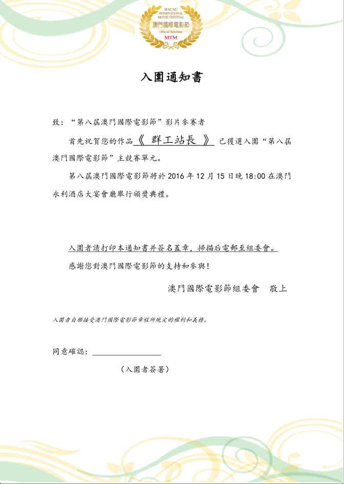 由中共上饒市宣傳部、中共石家莊市委宣傳部、中共萬年縣委、縣政府等單位聯(lián)合拍攝,本公司出品制作的電影《群工站長》今日入圍第八屆澳門國際電影節(jié)。