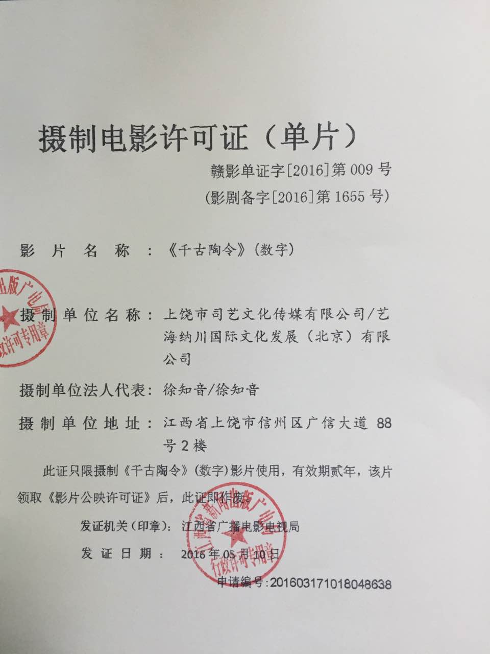 公司新籌備項目年代傳記電影《千古陶令》獲得攝制許可證,該片主要講述了陶淵明在叔叔的舉薦下當上彭澤縣令,上任伊始革除舊習,為民伸冤,懲治了地頭蛇曹祖光,得罪了督郵。督郵帶領爪牙,要治陶淵明。陶淵明掛印棄官。僅做了八十余天的縣令?;剜l(xiāng)后寫下了著名的《桃花源記》。有合作意向的朋友可以與我們聯系,一同打造這部人文經典。