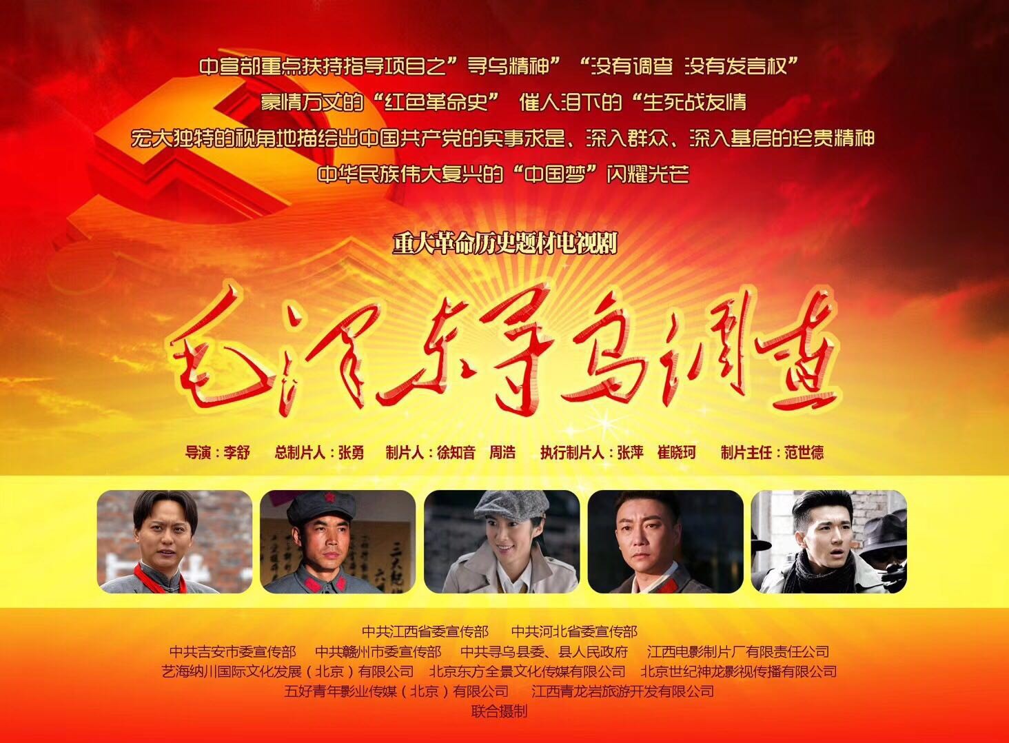 由中共江西省委宣傳部、中共河北省委宣傳部、中共吉安市委宣傳部、中共贛州市委宣傳部、中共尋烏縣委、中共尋烏縣人民政府、江西電影制片廠有限責任公司、藝海納川國際文化發(fā)展(北京)有限公司、北京東方全景文化傳媒有限公司、上饒市司藝文化傳媒有限公司、北京世紀神龍影視傳播有限公司、五好青年影業(yè)傳媒(北京)有限公司、江西青龍巖旅游開發(fā)有限公司聯(lián)合攝制,國家一級導演李舒指導,侯京健領銜主演的重大革命歷史題材電視劇《毛澤東尋烏調(diào)查》,自11月在江西開機以來,已經(jīng)拍攝90多天。劇組大隊人馬從江西轉場至橫店之后,即緊張有序地投入了拍攝的收官階段。2月5日,隨著導演李舒低沉而有力的一聲“過!”該劇在橫店影視城完成了最后一個鏡頭的攝制,全劇圓滿殺青.