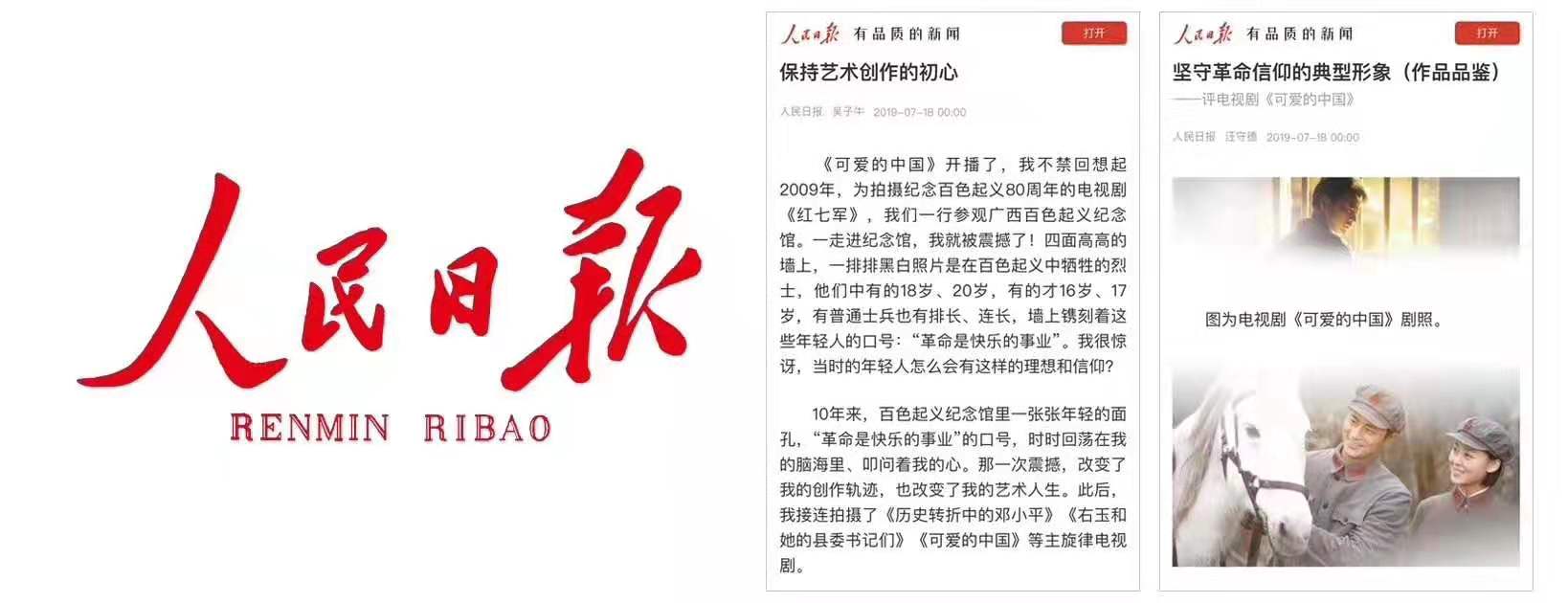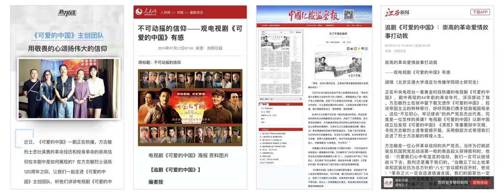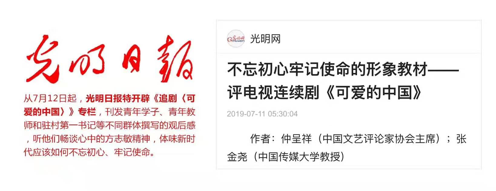 眾多權(quán)威媒體及傳媒人、影評(píng)人均撰文表達(dá)了對(duì)本劇的肯定及喜愛?!度嗣袢?qǐng)?bào)》盛贊本劇“呈現(xiàn)出精深、精湛、精致的藝術(shù)品相,堪稱一部成功而完整講述方志敏主要革命斗爭(zhēng)事跡的電視佳作”;《文匯報(bào)》刊出題為《電視劇<可愛的中國>:總有一種力量讓我們淚流滿面》的影評(píng),指出本劇為廣大觀眾還原了一位“有血有肉、靈魂飽滿、給人以希望、熱望、盼望”的方志敏;《光明日?qǐng)?bào)》從“筑牢信仰之基、補(bǔ)足精神之鈣、把握思想之舵”的三重角度,盛贊本劇為“不忘初心牢記使命的形象教材”。