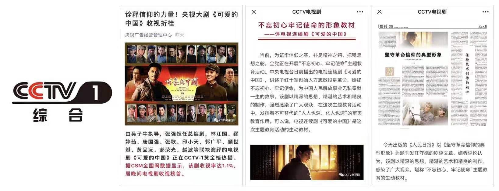 由中宣部重點(diǎn)扶持,中央電視臺(tái)、江西省委宣傳部、浙江省委宣傳部、福建省委宣傳部、江西廣播電視臺(tái)、藝海納川國際文化發(fā)展有限公司、五好青年影業(yè)傳媒(北京)有限公司等出品的重大革命歷史題材電視連續(xù)劇《可愛的中國》今晚在CCTV-1晚間黃金檔完美收官。